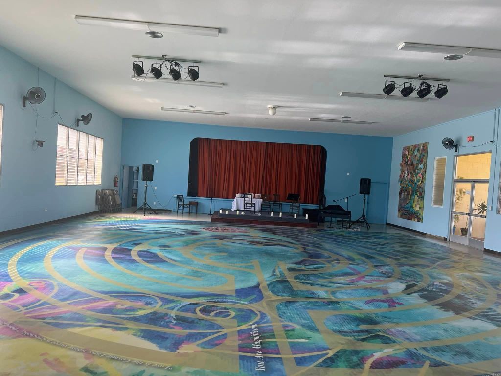 This labyrinth began with a vision I had to have a permanent labyrinth at our new space on the Hongwanji property in Kapaa. We knew it would be costly. As we did our research different ideas and focuses for its creation evolved. Finally, Isha Doellgast, an amazing artist stepped forward to help. Along with my friend Melissa Mojo, we decided that the labyrinth would be superimposed on one of Isha’s paintings. It was a long process and we still didn’t know where the funds would come from. We kept going, and I held the vision of us all walking this labyrinth on the 31st of December 2023 – New Year’s Eve. I let go of the hows and means by which it would happen and we just kept planning and creating. That was when the miracle occurred.