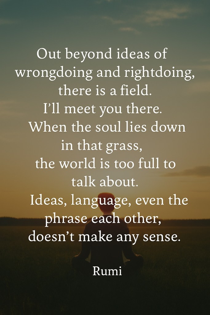 “Out beyond ideas of wrongdoing and rightdoing, there is a field. I’ll meet you there. When the soul lies down in that grass, the world is too full to talk about. Ideas, language, even the phrase each other, doesn’t make any sense.”