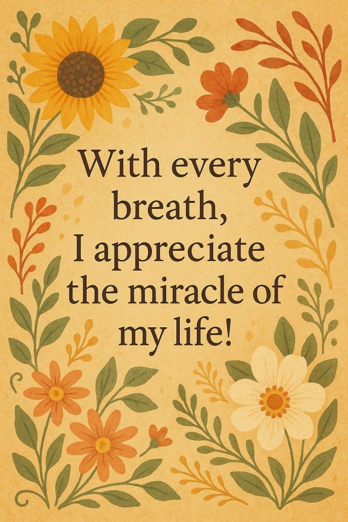 Place your hand on your heart. Take a few deep breaths. When you feel that alignment within, repeat with me: “With every breath, I appreciate the miracle of my life.”