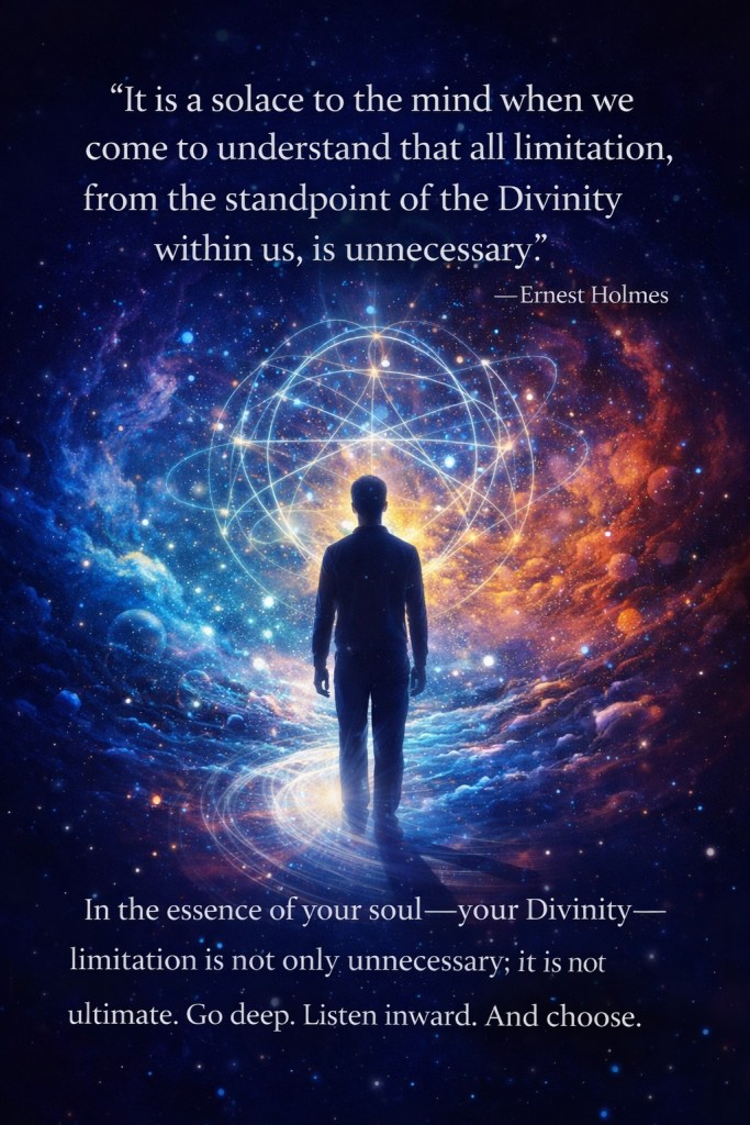 And this brings me back to Ernest Holmes’ quote. It is a solace to my mind to remember that within the great Allness—the eternality of every soul, the Presence we call Divine—limitation is unnecessary. Why is that a solace? Because whenever I turn my attention toward Spirit—toward the essence that is free beyond form, yet expressing as form—I remember that life can shift. The moment is alive. New outcomes can emerge.